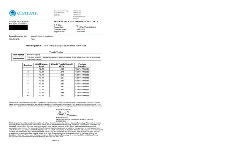 Each stud is tested in a range of 222778 PSI to a whopping 250,190 PSI with the average stud being 228,579 PSI. These studs are recommended for stock trucks all the way up to 800hp.