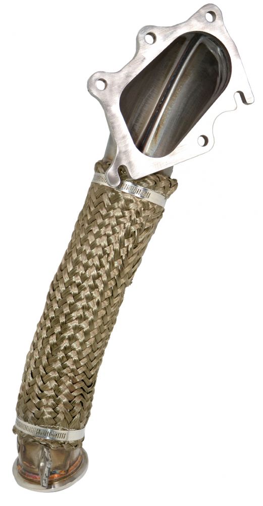 Remove your crushed oval-shaped stock down-pipe and replace it with a smooth, round, long-lasting full 304 stainless steel Down-Pipe from PPE. Includes a woven titanium sleeve to reduce engine bay temperatures.