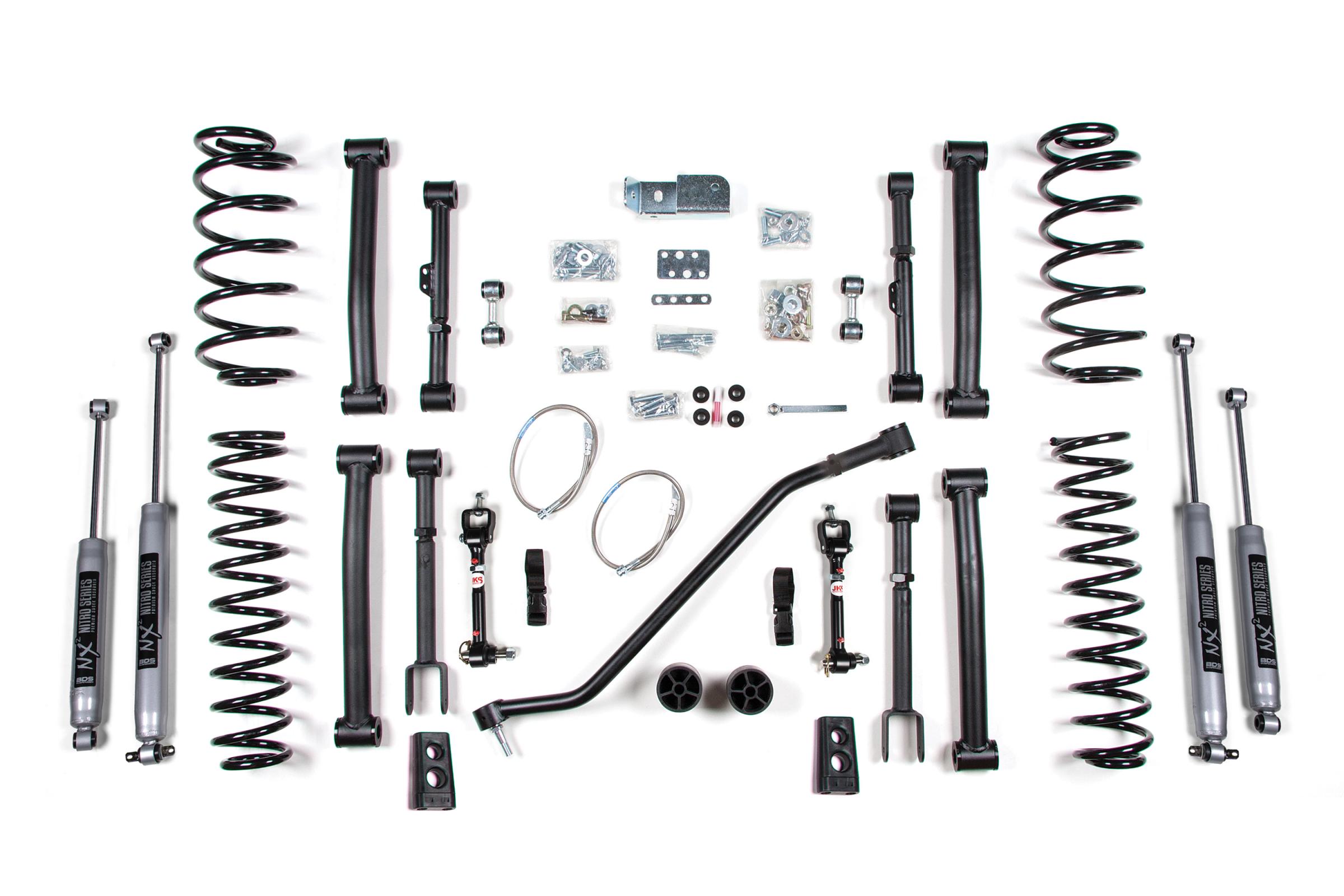 The lift kit includes front BDS Pro-Ride Coil Springs, a heavy duty adjustable front track bar that is utilized to recenter the front axle, bump stop extensions, stainless braided brake lines, sway bar quick disconnects to unlock the front suspension's potential to flex while maintaining quiet on road operation, and heavy duty front upper adjustable and fixed length lower control arms.