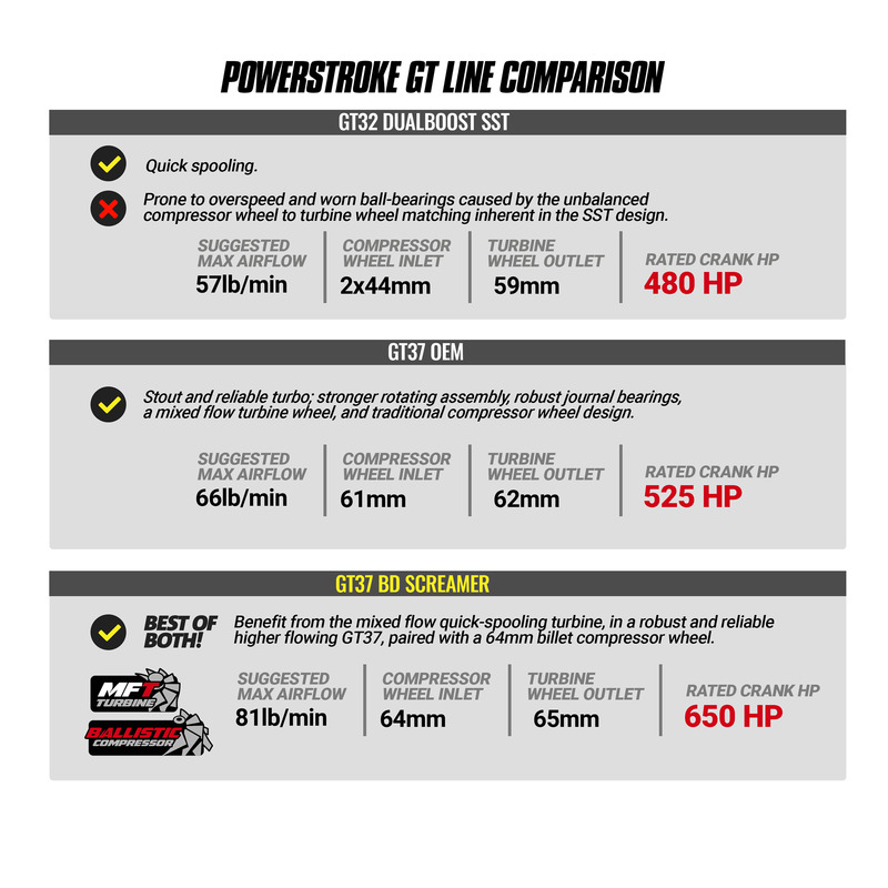 The Powerstroke Screamer turbo works with any box tuner and further improvements achieved with custom tuning. Drop-in turbo reuses the factory 2017-2019 turbo pedestal.