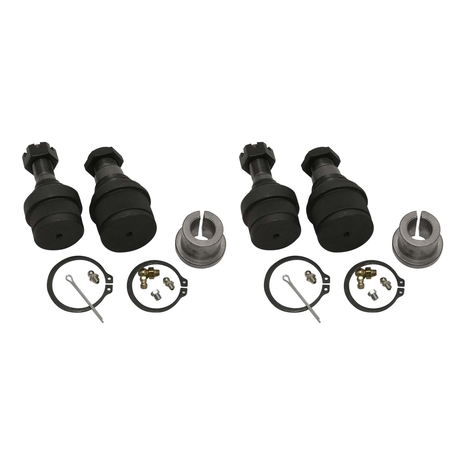 This kit replaces the upper and lower front ball joints on both sides and includes Grade 8 hardware, castle nuts, c-clips, cotter pins, and zerk fittings.