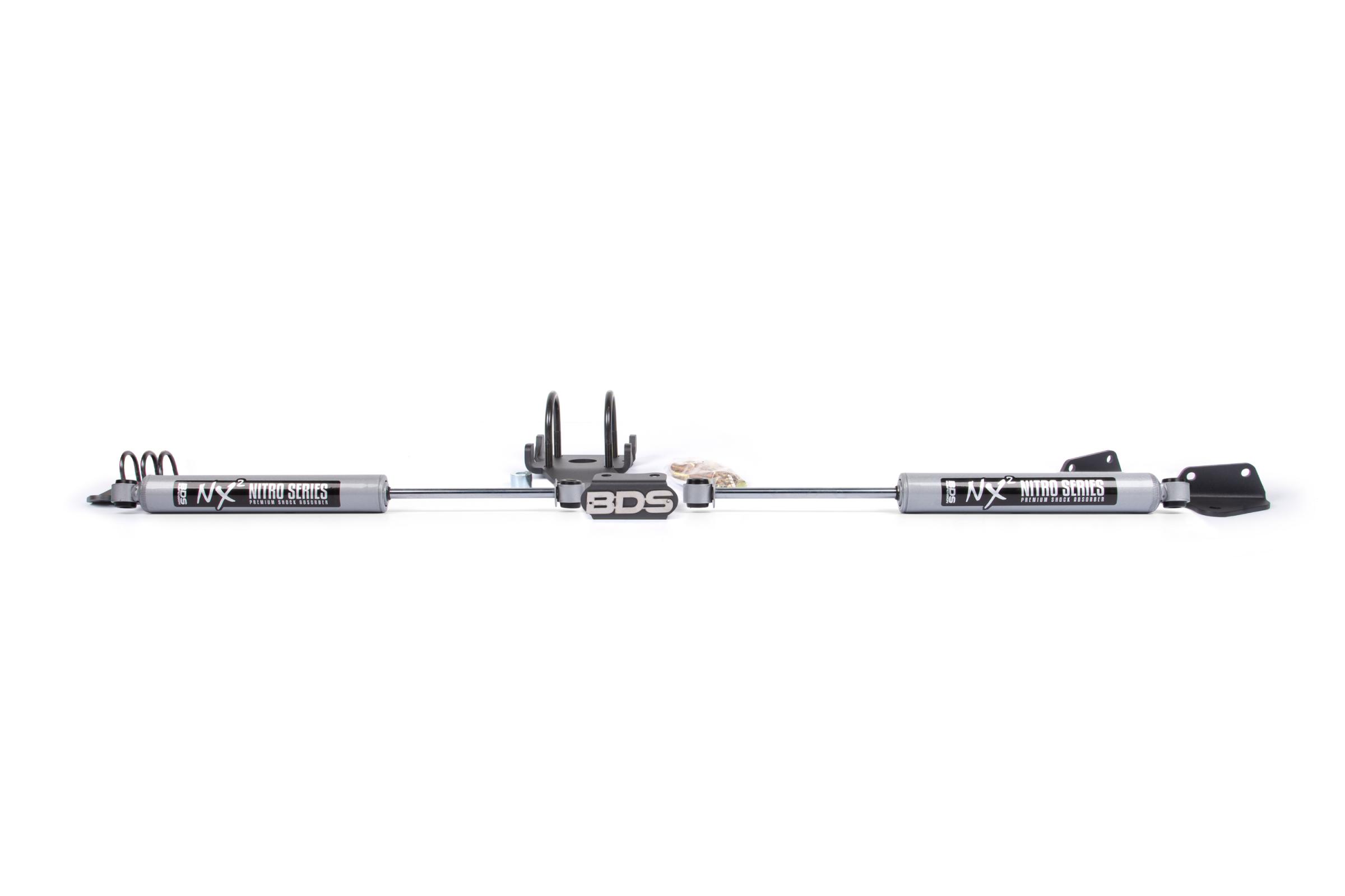 Enhance the handling of your 2009-2013 Dodge Ram 2500/3500 4WD by installing a BDS dual steering stabilizer mounting kit with NX2 shocks. Installing larger Tires can exert additional force on your truck's suspension, but steering stabilizer shocks can effectively reduce bump steer and steering wheel feedback.