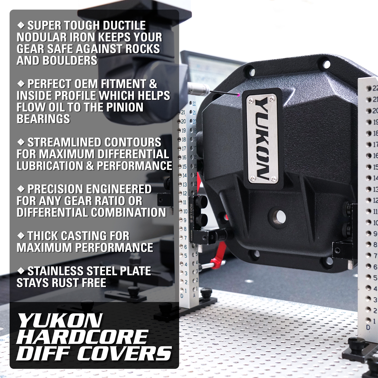 Yukon Hardcore Diff Covers are constructed from thick-walled, high-strength nodular steel to protect lockers, gears and axles from the most extreme hits in off road driving. They also increase the structural rigidity of the differential, reducing deflection under high-torque situations that can put severe loads on vital internal parts.