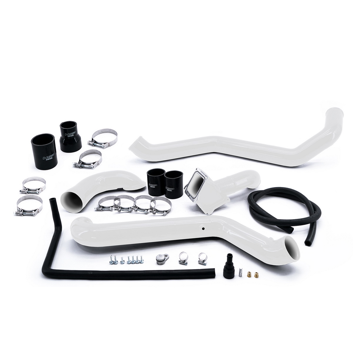 The two-piece design from the factory has crimped on boots that have a tendency to fail under heat and pressure, it's only a matter of time before it leaves you on the side of the road. The factory cold side also has its limitations and is made of plastic with an unreliable clamping system. This kit replaces all the failure-prone piping and will come with our race-proven 5 layer silicone boots to give you years of worry-free driving.