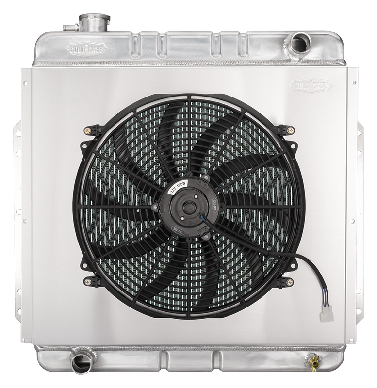 1953-1956 Ford F-Series Truck Coyote Swap Aluminum Performance Radiator and 16 inch Fan Module. COLD-CASE has taken the worry out of swapping the popular Coyote Engines in you F Series truck with this Coyote specific swap radiator kit. Along with all the great features Cold Case is known for this radiator has the correct hose connections to make your install a breeze.