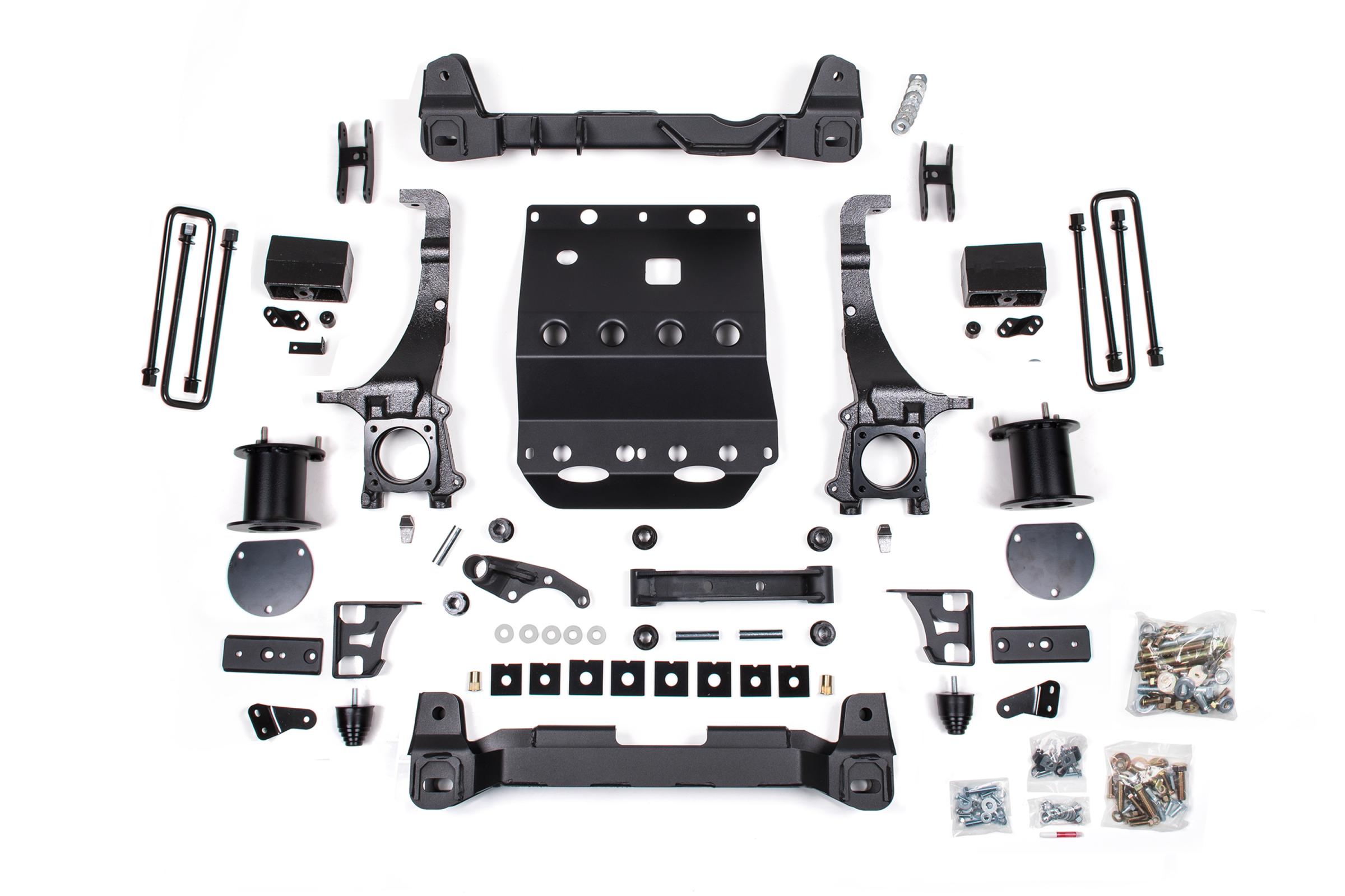 This kit takes advantage of BDS's tried and true high-clearance design for improved ground clearance, strength, and offroad protection while correcting suspension and steering geometry for great on-road handling characteristics. Up front, the kit utilizes top mounted strut spacers, high-arched 1/4-inch thick steel crossmembers along with a multipiece differential relocation brackets and heavy duty skid plates built for offroad protection.
