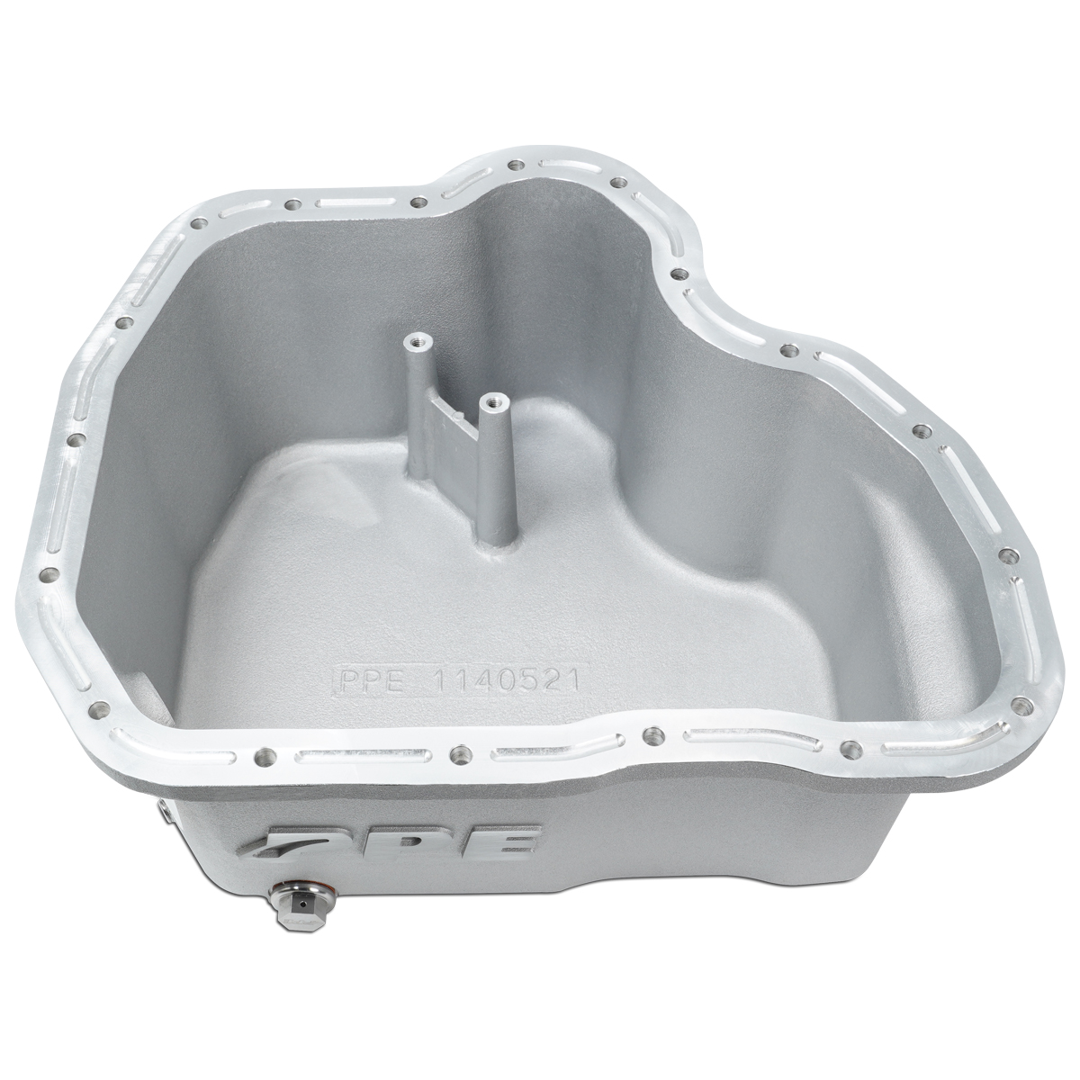 PPE solves these problems. First, this Deep pan is engineered with a flat bottom. This feature allows you to drain all of your oil pans dirty engine oil. Second, its made from cast aluminum for strength and optimum heat dissipation. Third, >PPEs new Deep oil pan holds an extra quart of oil so you will see reduced oil temperature, higher oil pressure, and better lubrication to your engines vital components.