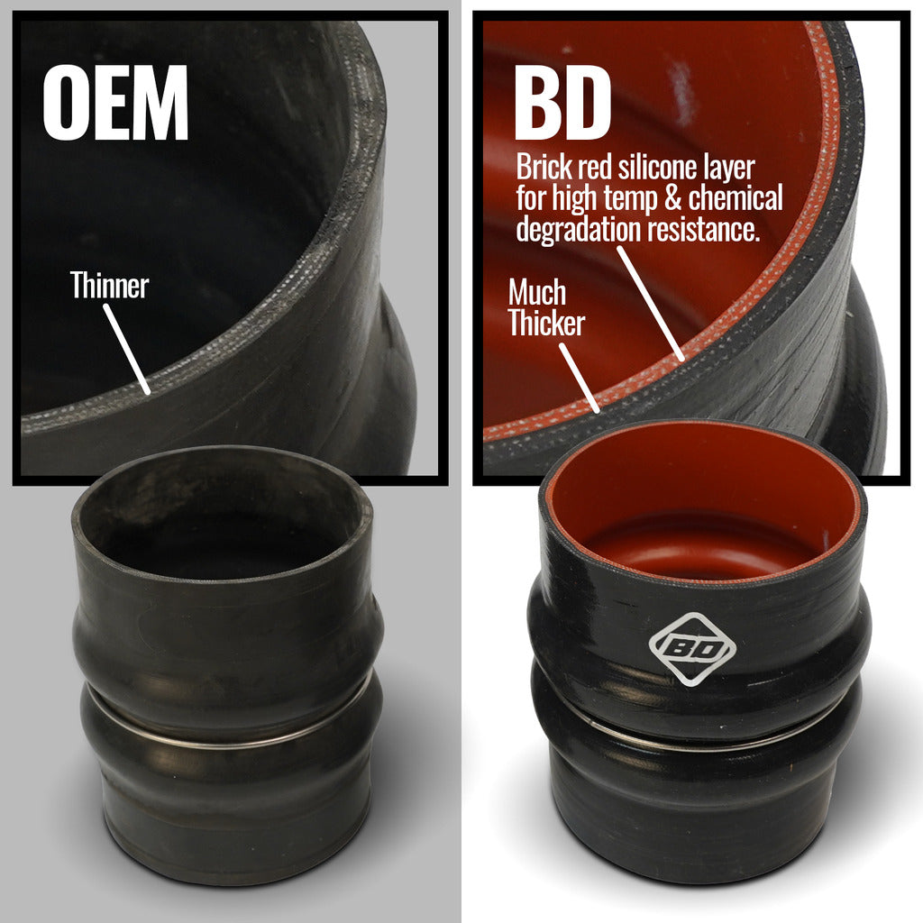 The BD Boot and Clamp kit for the 2013-2018 Ram Cummins includes 4 boots made with HD silicone and aramid layers with 8 constant tension spring clamps. These heavy-duty spring clamps provide 900lbs of tensile clamping load while holding maximum boost pressure. The 5 ply multi-layer boots are designed to handle high temperature and pressure, and are resistant to degradation from fuel, oil and other chemicals.