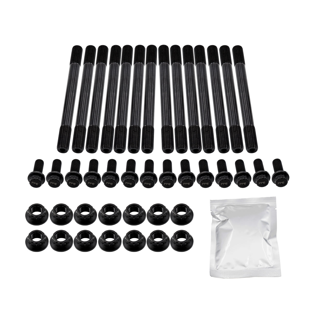 The PPE Main Studs are constructed of premium chrome-moly alloy with over 215,000 psi yield strength and over 230,000 psi tensile strength. Each stud is heat treated before being centerless ground and thread rolled, which effectively reduces stress concentration and results in a much higher fatigue resistance. Broaching of studs is performed via EDM to ensure top-level precision. All studs and nuts come with black oxide finish.