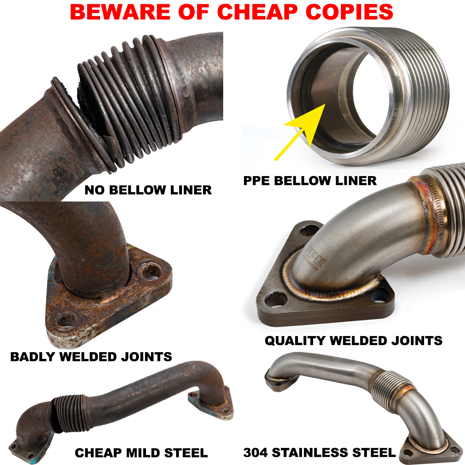 Diesel engines (even stock) produce high temperatures and pressures. OEM up-pipes eventually fail from constant temperature and pressure fluctuation. These PPE up-pipes are designed and manufactured as replacement up-pipes for PPE High Flow up-pipe kits