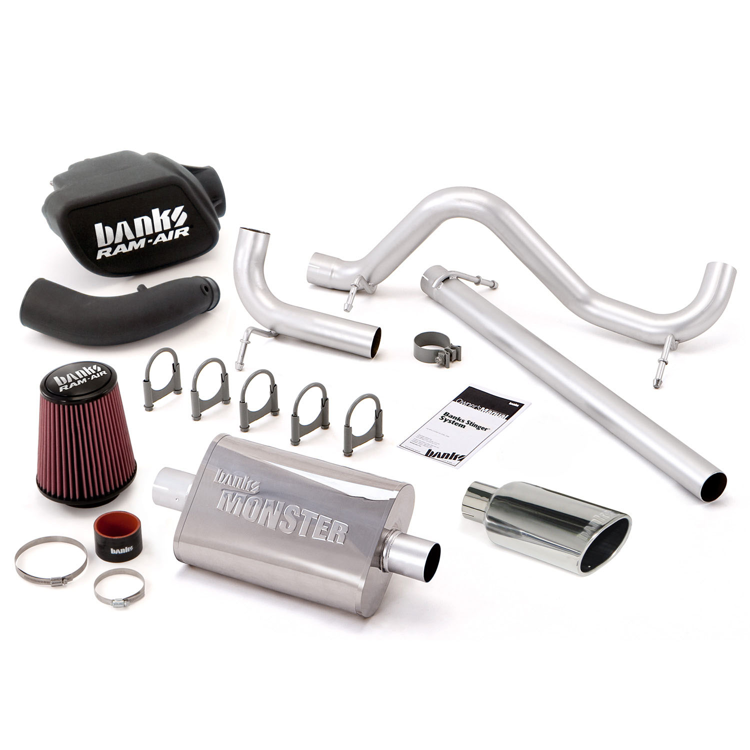 Optimizes airflow, air density, continuous power and MPG. Honors the host vehicle and improves longevity. Combines Ram-Air Intake and 100 percent stainless Monster Exhaust; dramatically improves engine breathing for greater efficiency, power and fuel economy. (2007-2011) Stinger is an engineered power system for Jeep street and off-road applications. With its free-breathing Banks Ram-Air Intake and Monster Exhaust upgrades, Stinger liberates 3.8L Jeeps from airflow restrictions, improving engine efficiency, durability and fuel economy while increasing power. The exhaust note is authoritative, yet civil, and includes a stainless tailpipe tip in your choice of polished chrome-over stainless or high-temp black!
